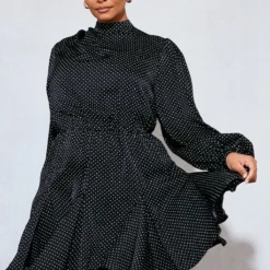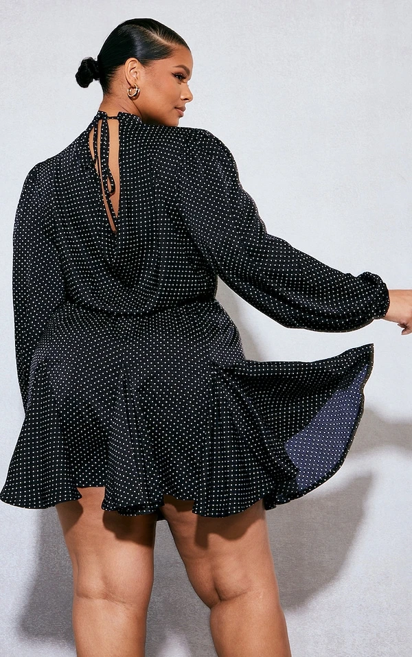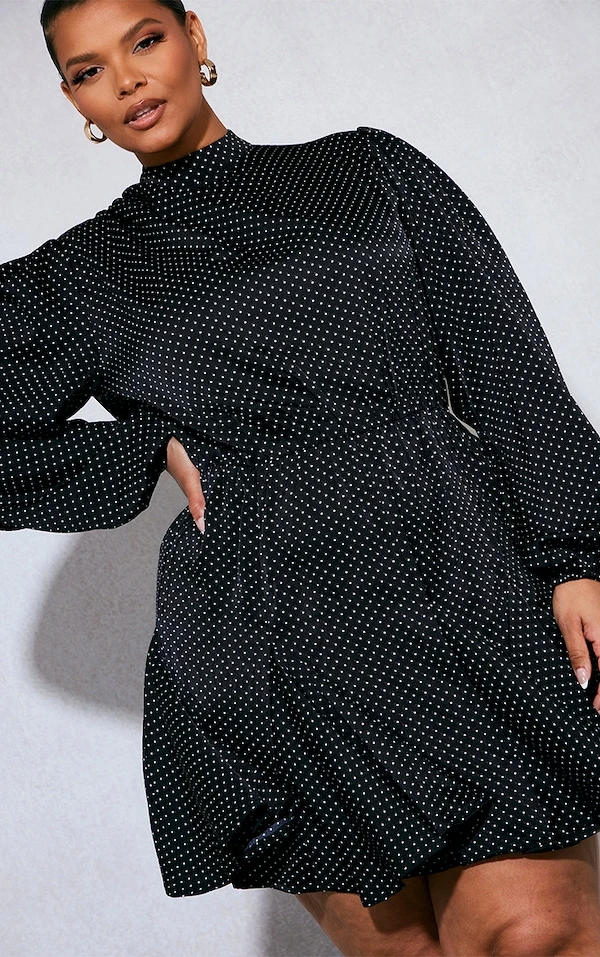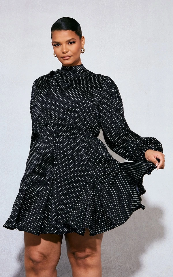 Plus Robe droite noire imprimé pois à ourlet plissé