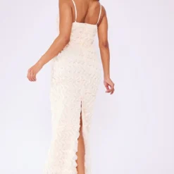 Robe Moulante Drapée En Dentelle Crème Transparente à Col Bardot Et Volants