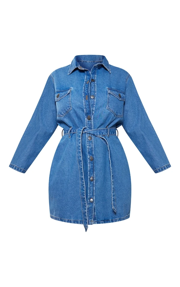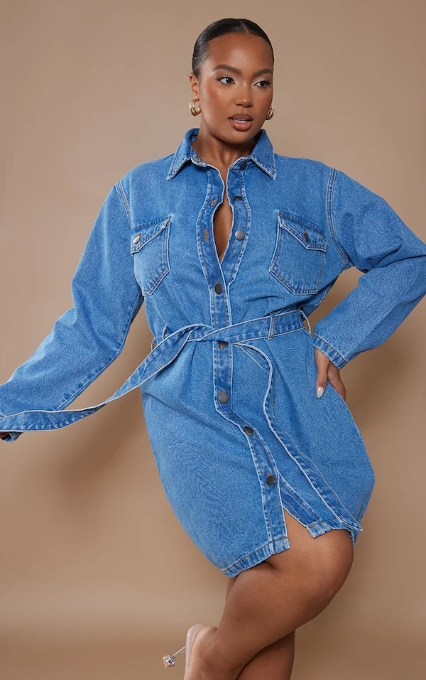 Plus Robe en jean bleu moyennement délavé effet javélisé à taille nouée