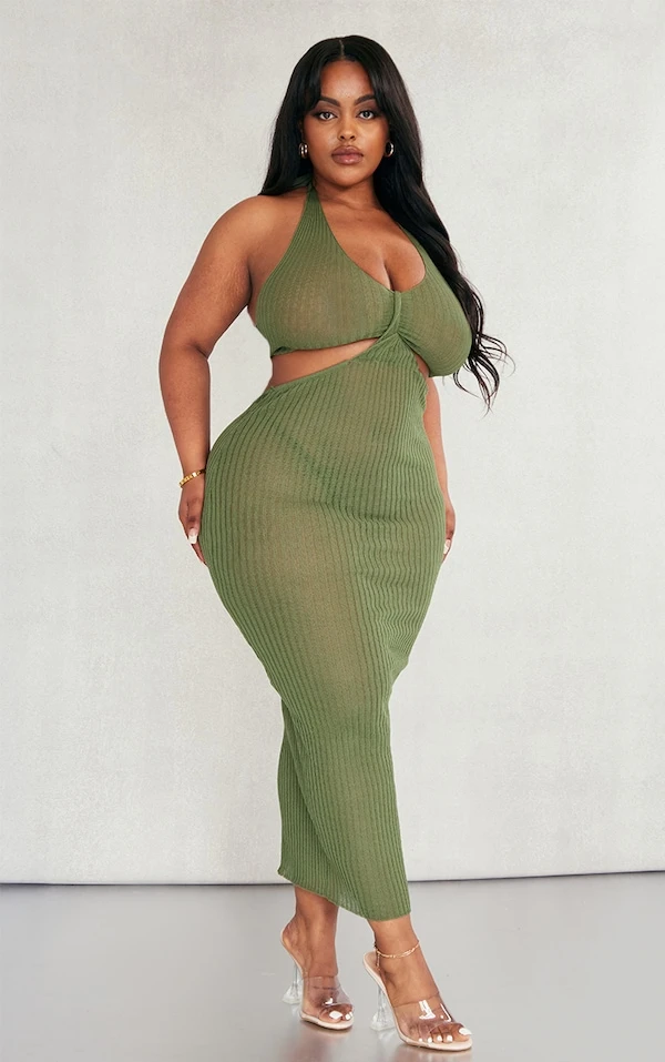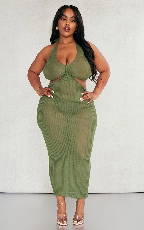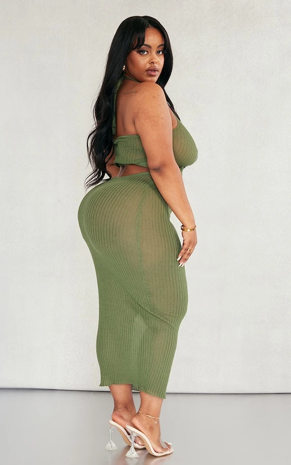 Plus Robe longue dos nu en maille kaki transparente effet croisé