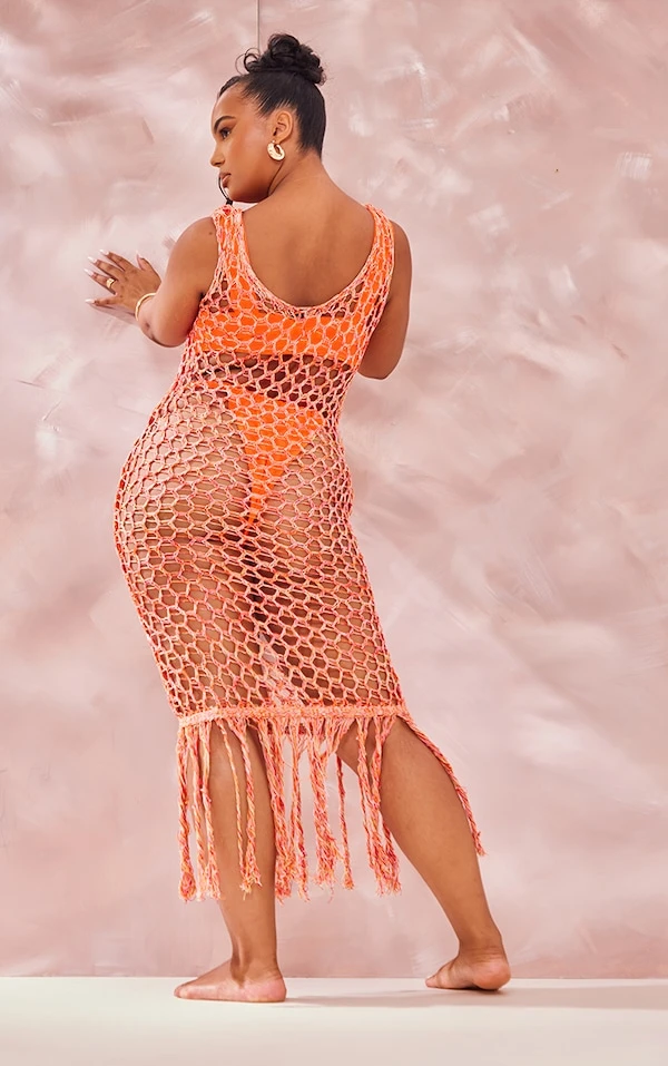 In love de cette robe longue ! On adore sa couleur orange qui attire tous les regards et sa matière en maille effet résille ultra canon. Il vous suffit de la porter par-dessus un maillot de bain coloré pour finaliser votre look. On ne voit que vous au bord de l’eau !