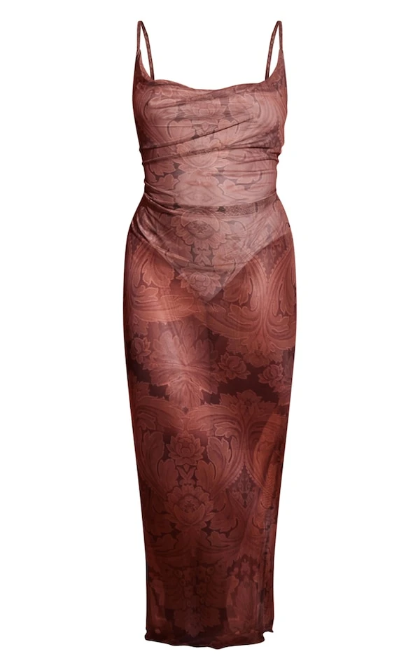 Plus Robe longue en mesh marron clair à imprimé fleuri et col bénitier