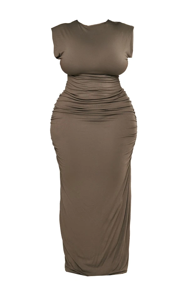 Plus Robe longue kaki mousse à épaulettes froncée sur le côté