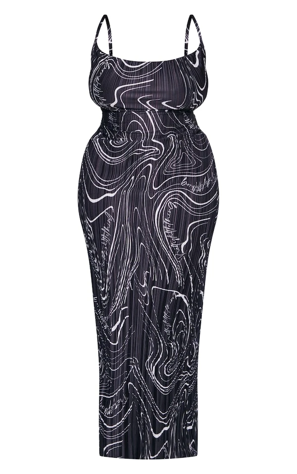Toute en longueur cette robe divine ! On crush sur sa matière plissée noire à imprimé tourbillons, son col bénitier et sa coupe longue. Pour un style de diva, on ajoute des talons transparents et des créoles. Impossible de vous rater !