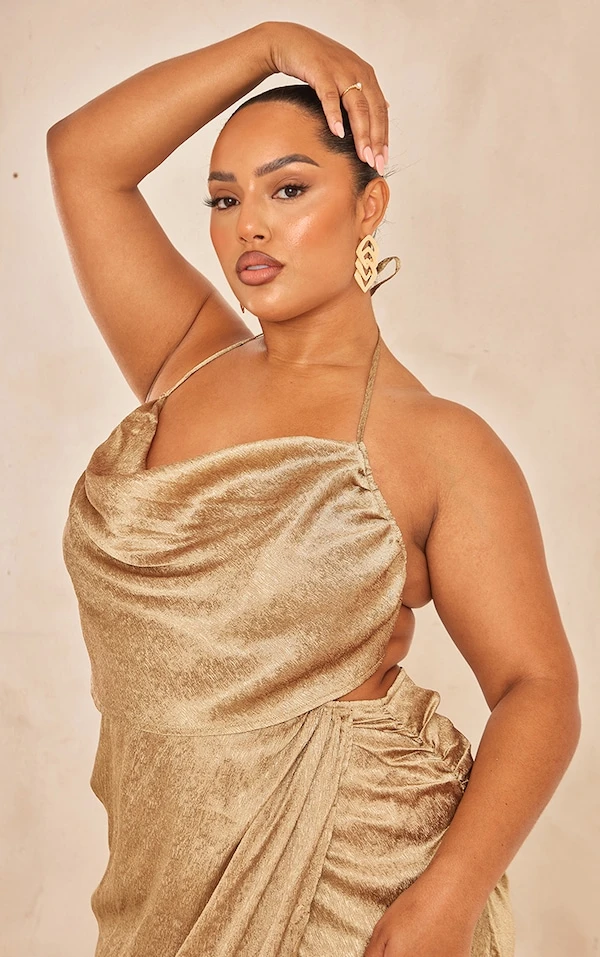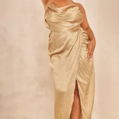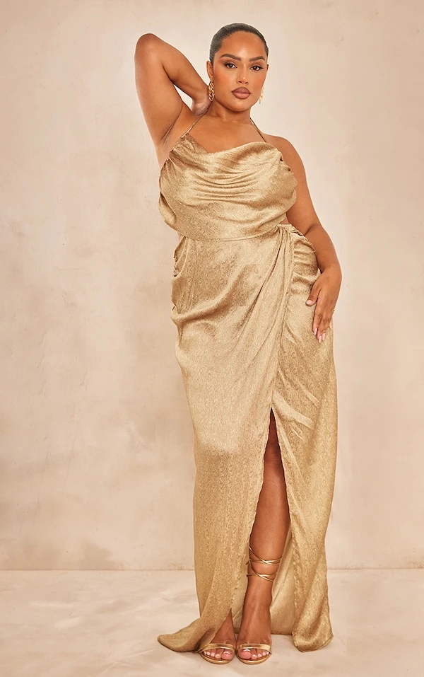 Plus Robe longue satinée dorée à col bénitier