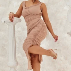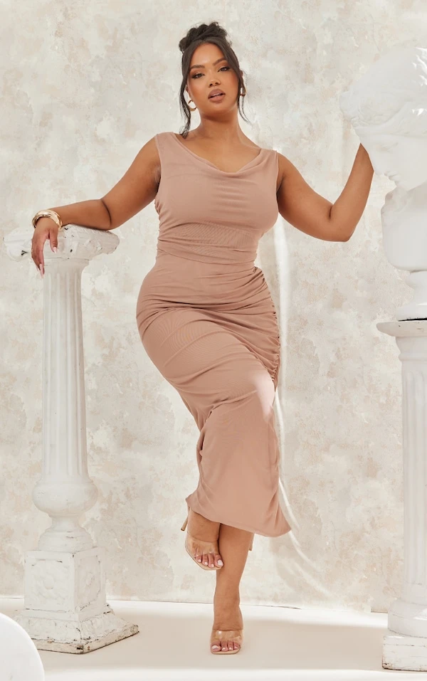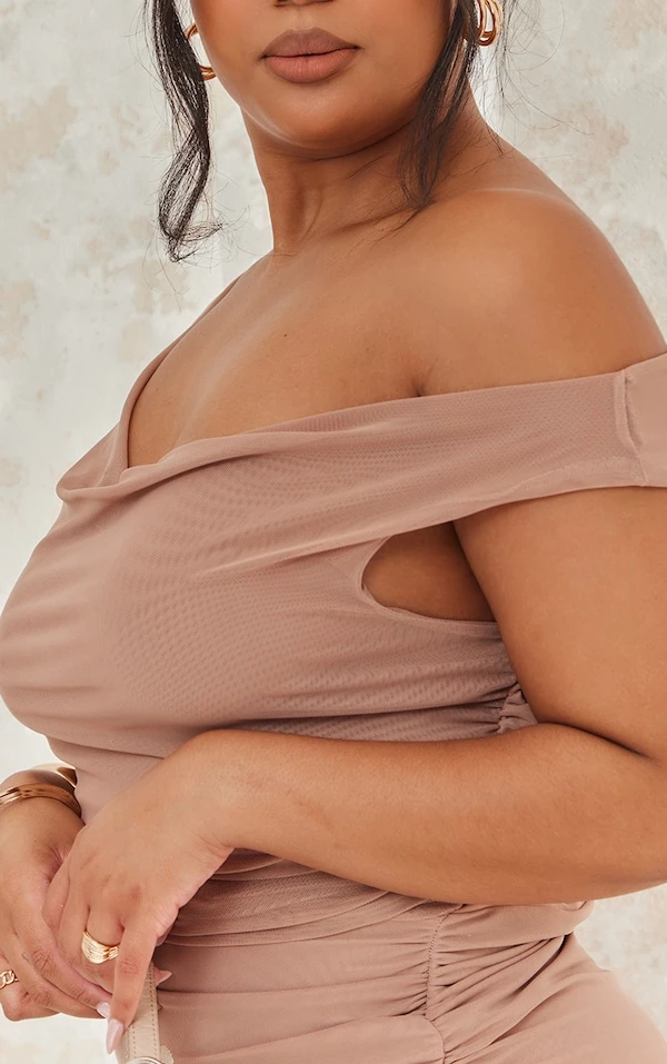Plus Robe mi-longue asymétrique froncée en mesh nude