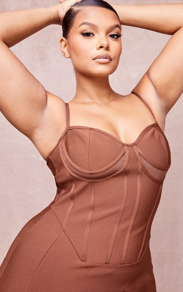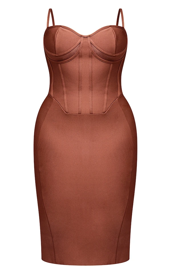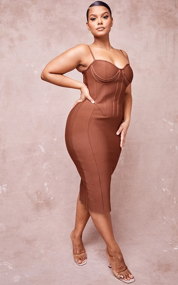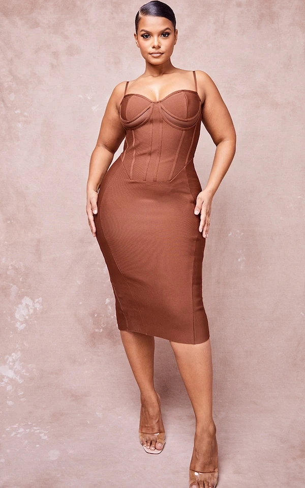 Plus Robe mi-longue bandage marron chocolat à bretelles et découpes sous le buste