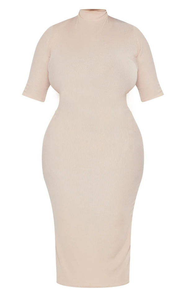 Plus Robe mi-longue côtelée café au lait rosé à col montant et demi-manches