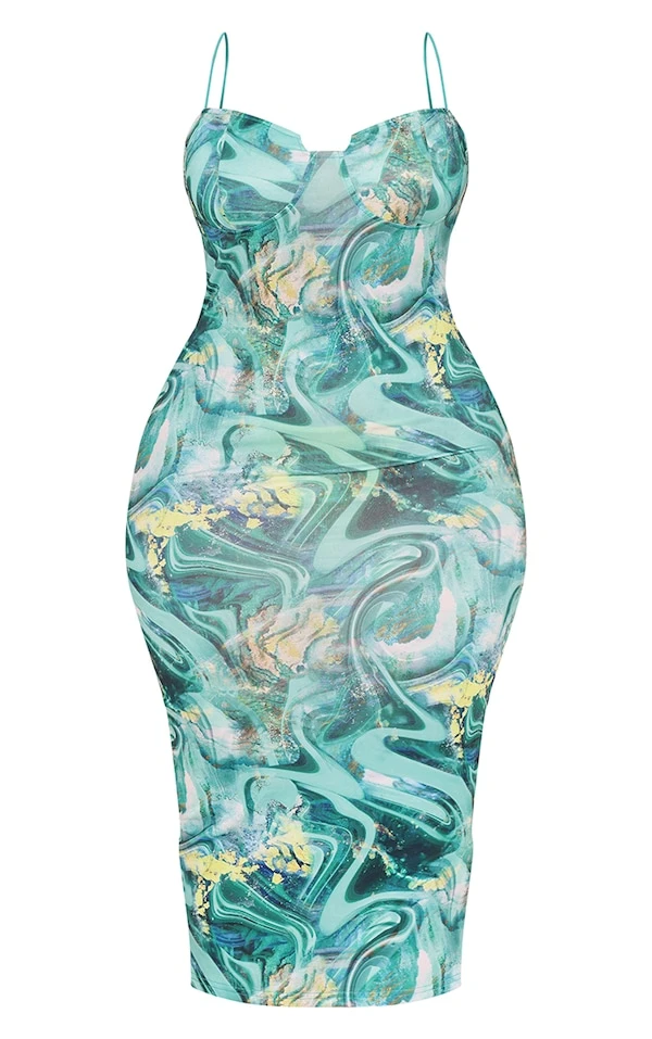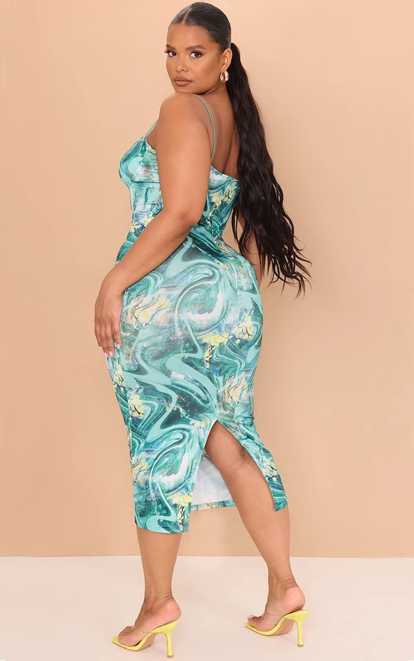Plus Robe mi-longue côtelée froncée verte imprimé tourbillon à bonnets