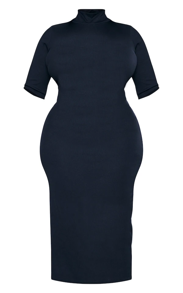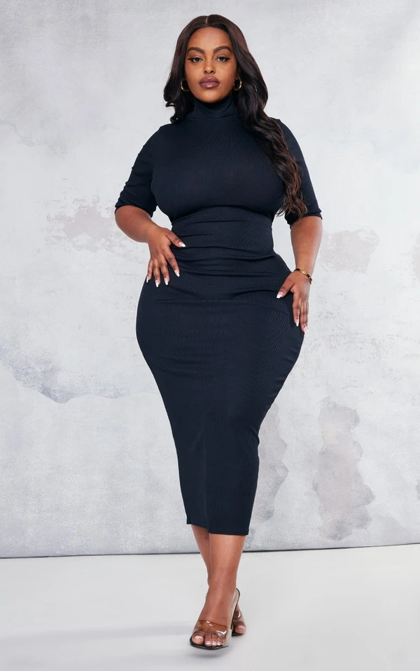 Plus Robe mi-longue côtelée noire à col montant et demi manches