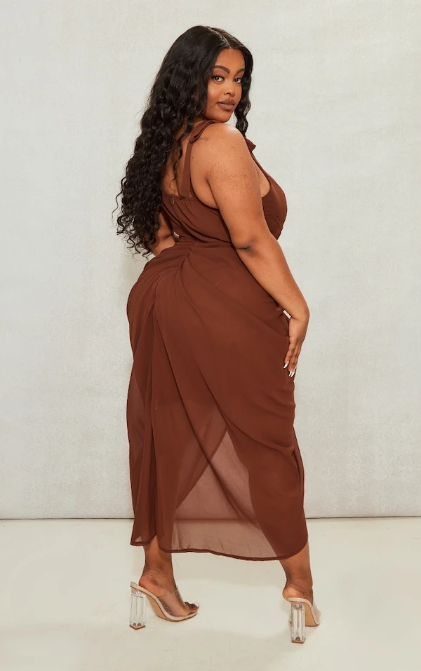 Délicieusement stylée dans cette robe à la coupe mi-longue ! Son design drapé rajoute des vibes très glam et on adore son coloris chocolat et son design à armatures. Pour finaliser ce look magnifique, enfilez une paire de sandales lacées et quelques bijoux gold. On est fans de vous !