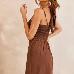 Absolument divine dans cette robe à la coupe mi-longue. Sa matière en effet lin est hyper canon et on adore son coloris crème tout doux. Avec son effet drapé, c’est un look 100% glam. On enfile une paire de talons hauts et des boucles d’oreilles XXL pour finaliser cette tenue spéciale.