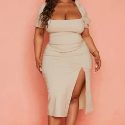 Plus Robe mi-longue en maille tissée stretch gris pierre à manches bouffantes