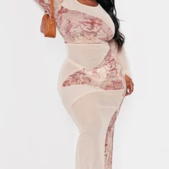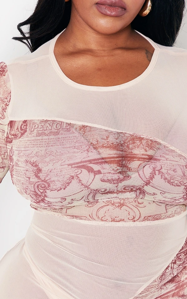 Plus Robe mi-longue en mesh marron imprimé statue contrastant