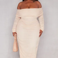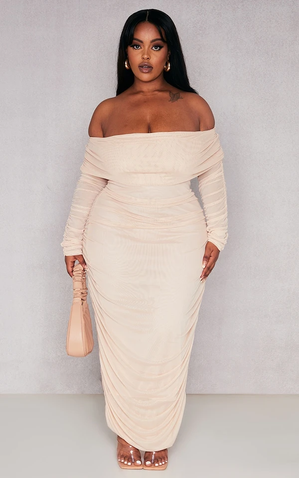 Plus Robe mi-longue en mesh nude à col bardot et manches longues