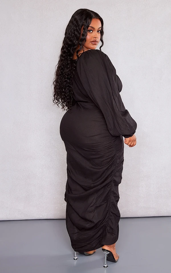 Plus Robe mi-longue fendue noire effet lin à fronces sur le côté