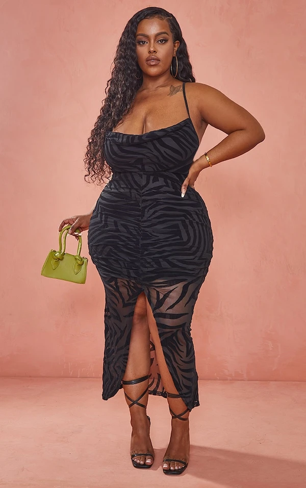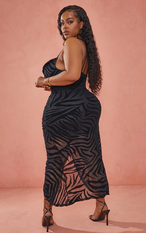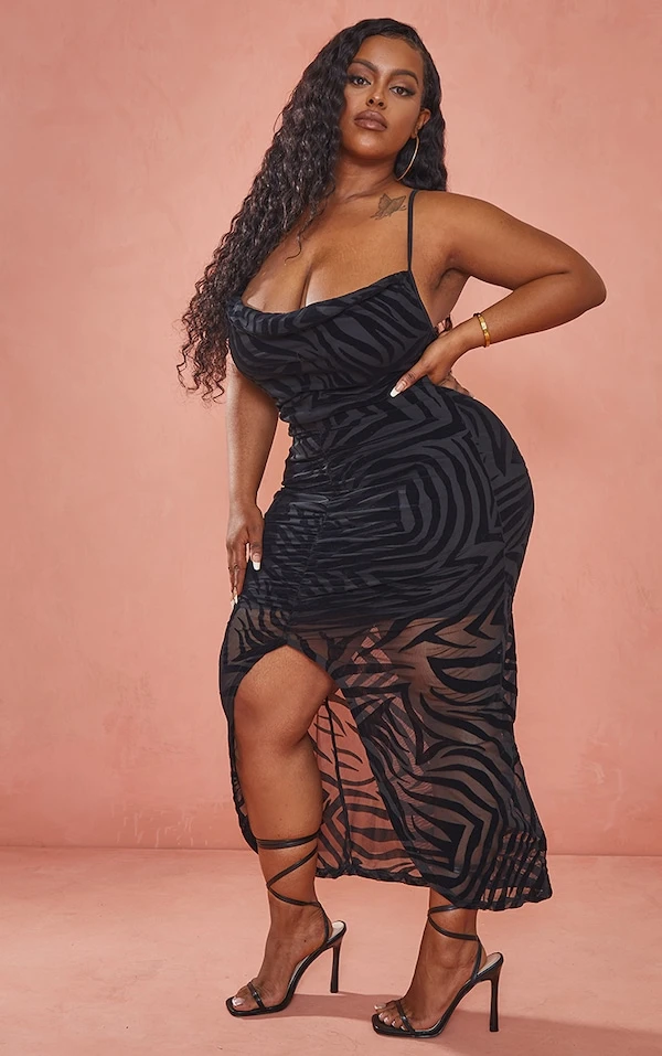 Plus Robe mi-longue froncée dévorée noire à col bénitier