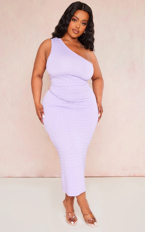 Plus Robe mi-longue lilas effet bulle texturée asymétrique