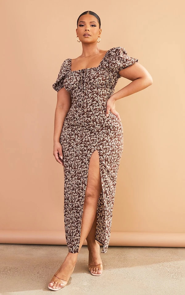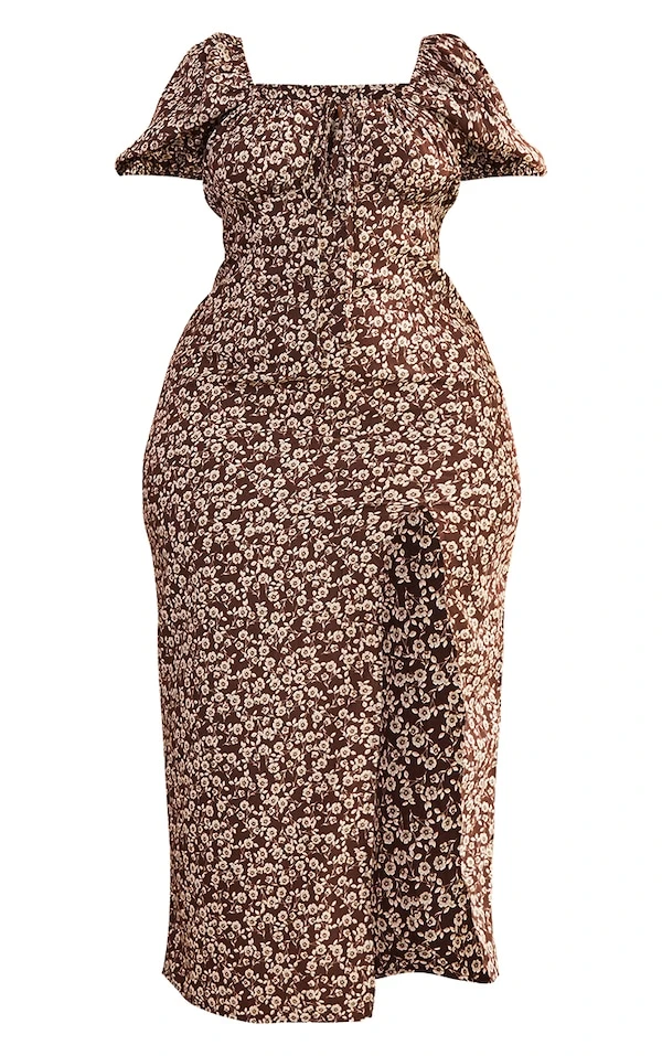 Plus Robe mi-longue marron chocolat à petites fleurs