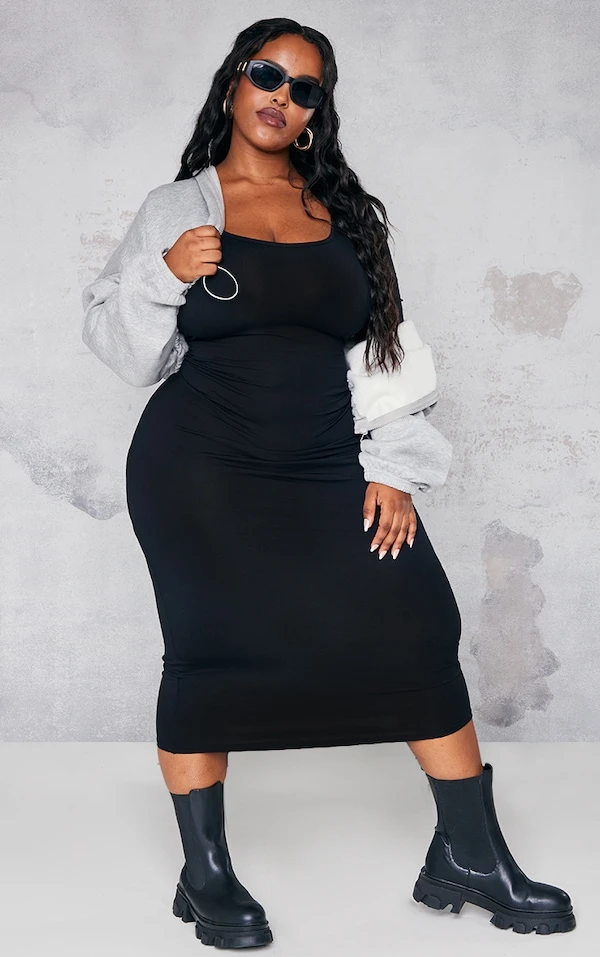 Plus Robe mi-longue noir profond à manches longues et col carré