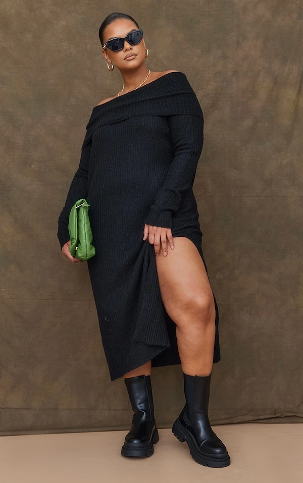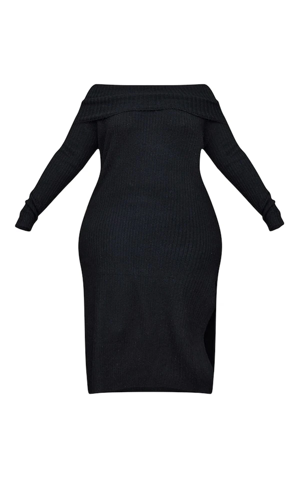 Plus Robe mi-longue oversize en maille tricot épaisse noire à col bardot