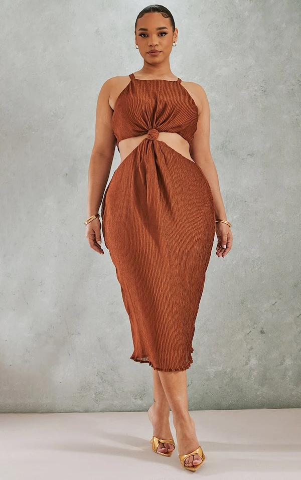 Plus Robe mi-longue plissée chocolat à détail noeud