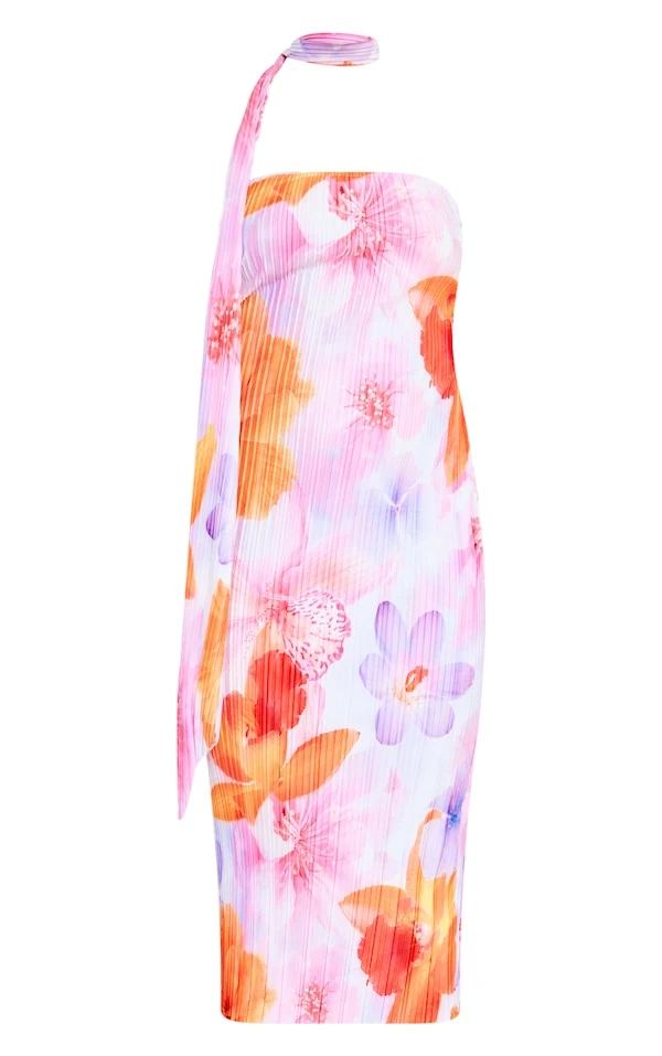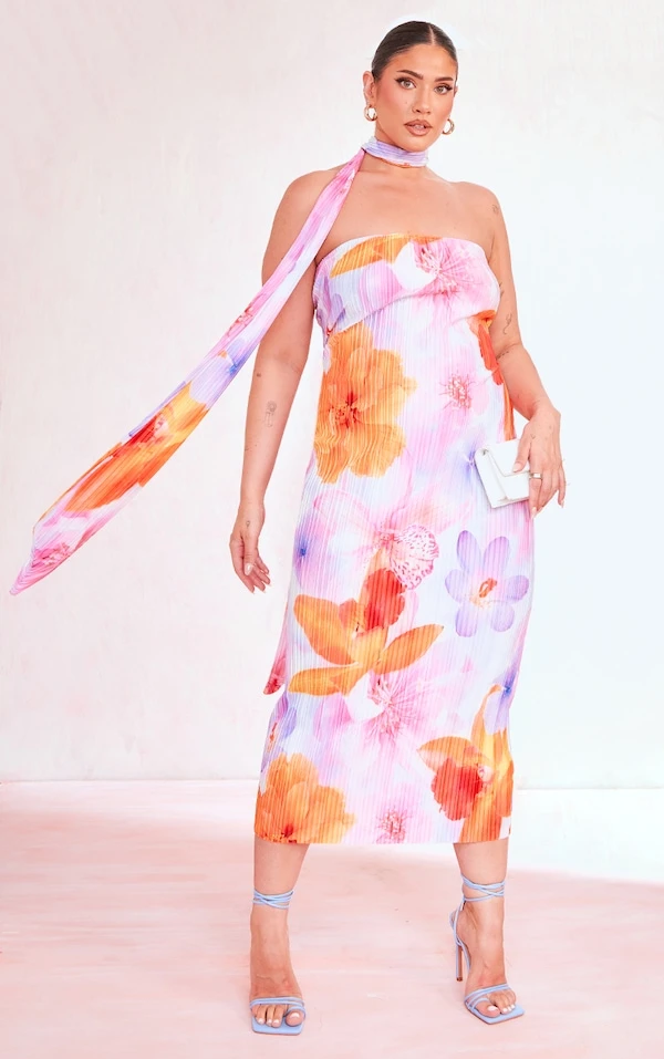 Plus Robe mi-longue plissée rose fleurie à col ras