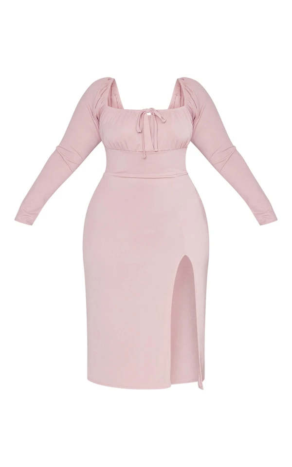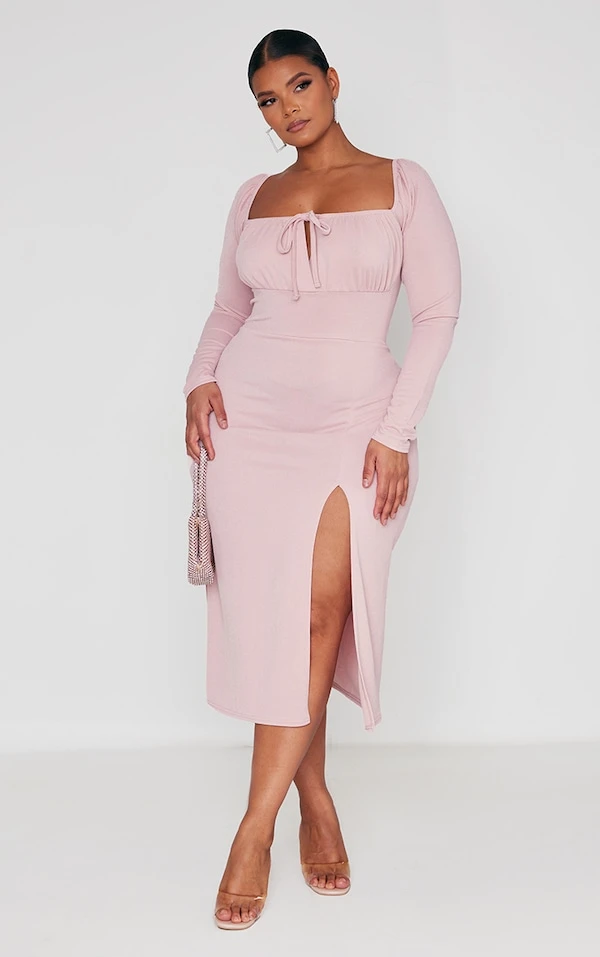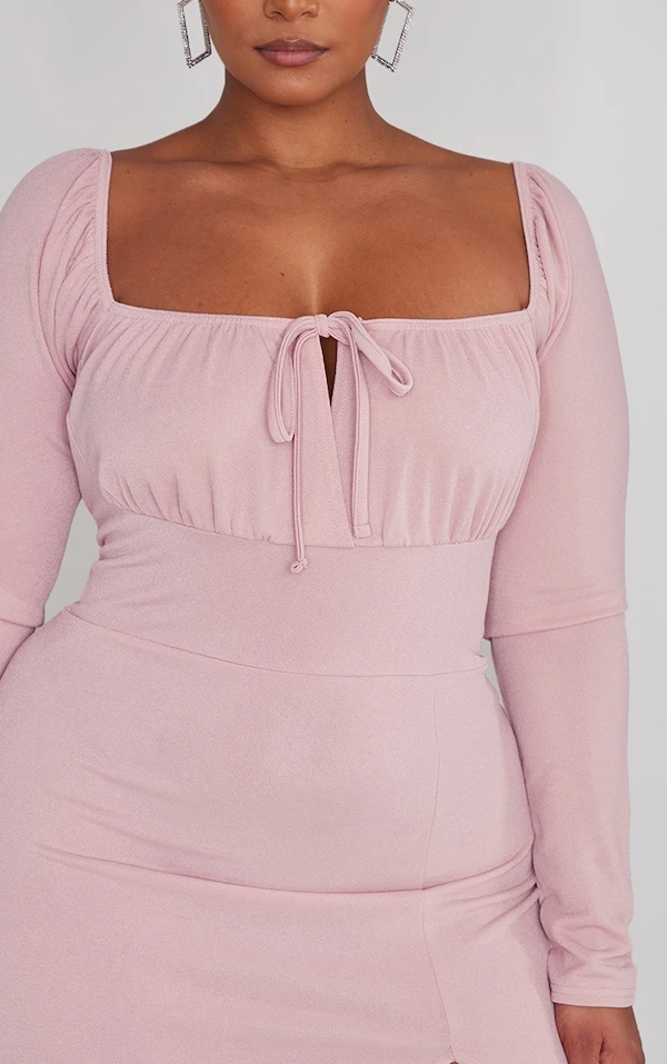 Plus Robe mi-longue rose nouée devant à manches bouffantes