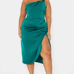 Plus Robe mi-longue satinée vert émeraude à détail drapé et ourlet fendu