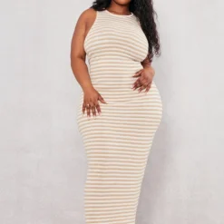 Plus Robe mi-longue texturée à rayures gris pierre et dos nageur