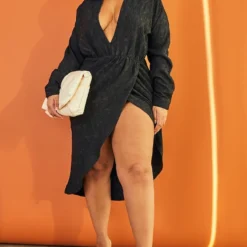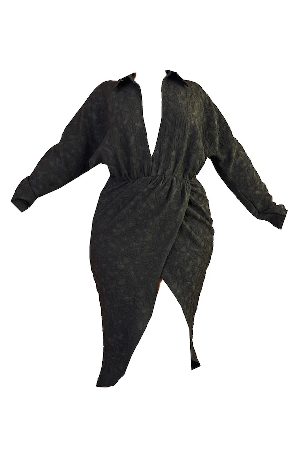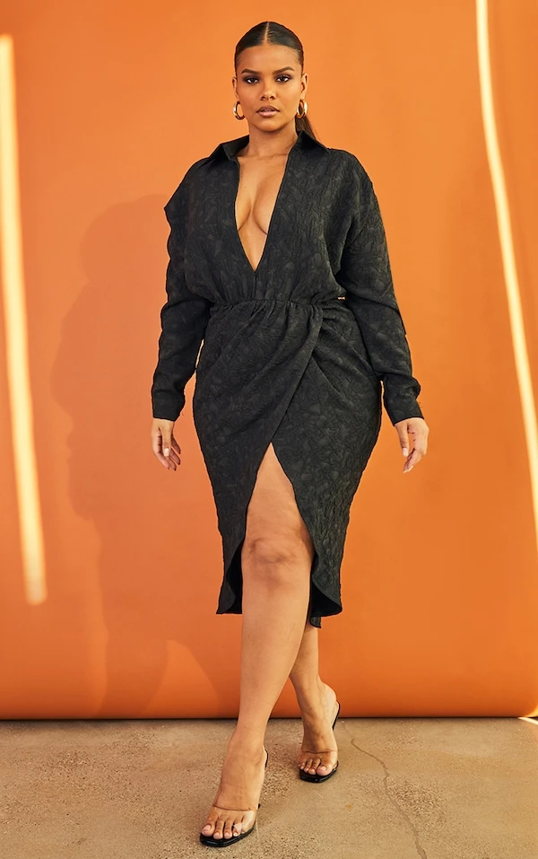 Plus Robe mi-longue texturée noire croisée sur la taille à décolleté
