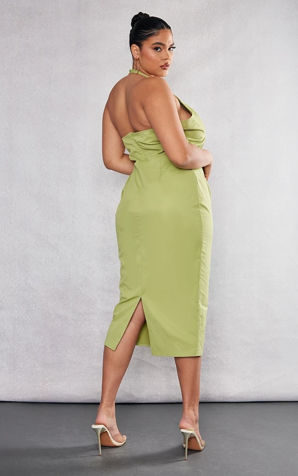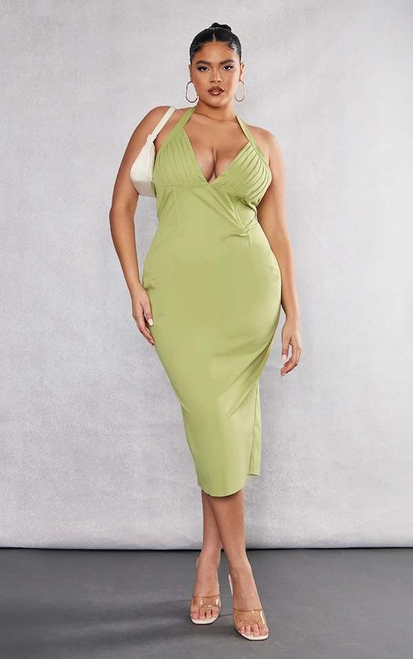 Plus Robe mi-longue vert olive à buste plissé