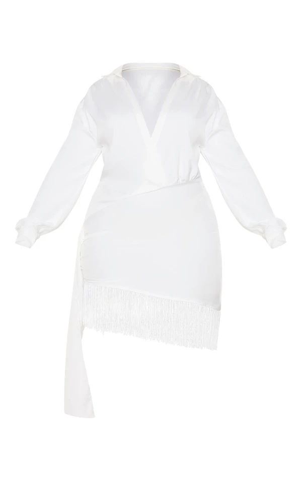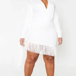 Plus Robe moulante blanche effet drapé à manches longues et franges