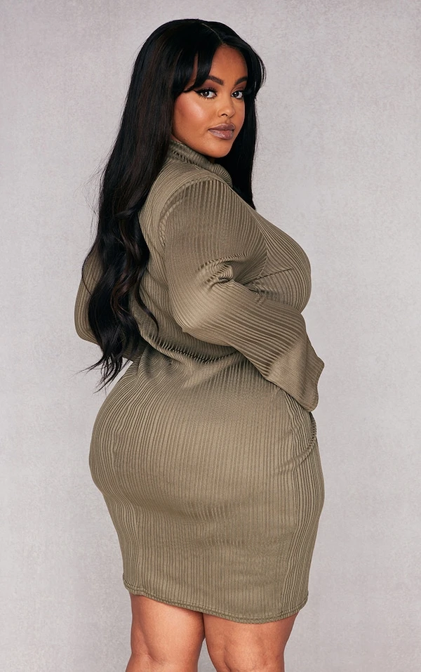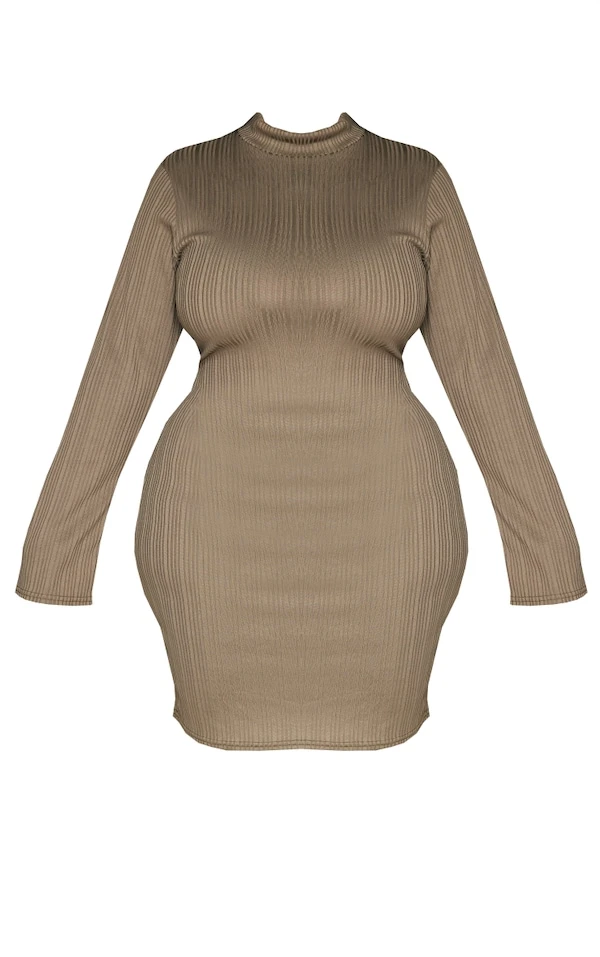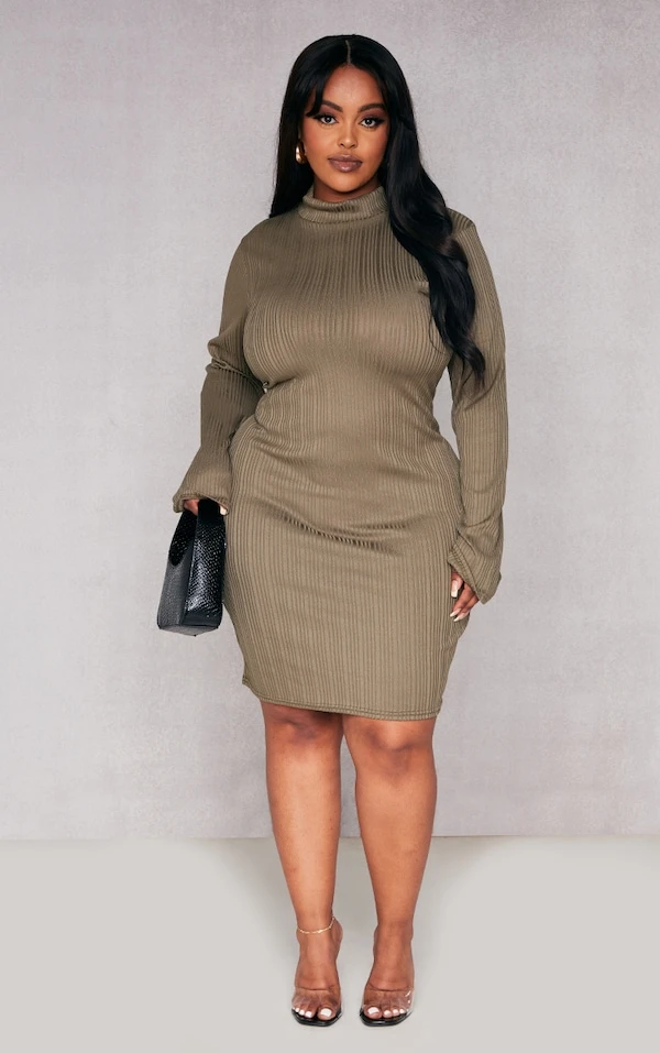 Plus Robe moulante côtelée kaki à col montant