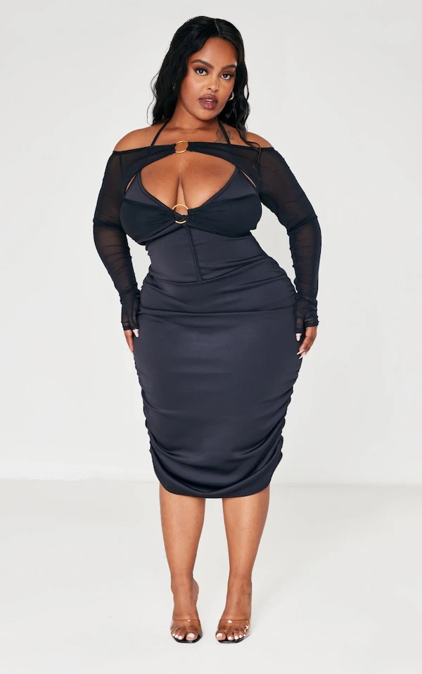 Une lady sophistiquée dans cette robe noire ! Avec sa coupe mi-longue, sa superposition de mesh et ses anneaux sur le devant, elle est originale tout en étant flatteuse. Il ne manque que des talons et un petit sac pour le look complet !