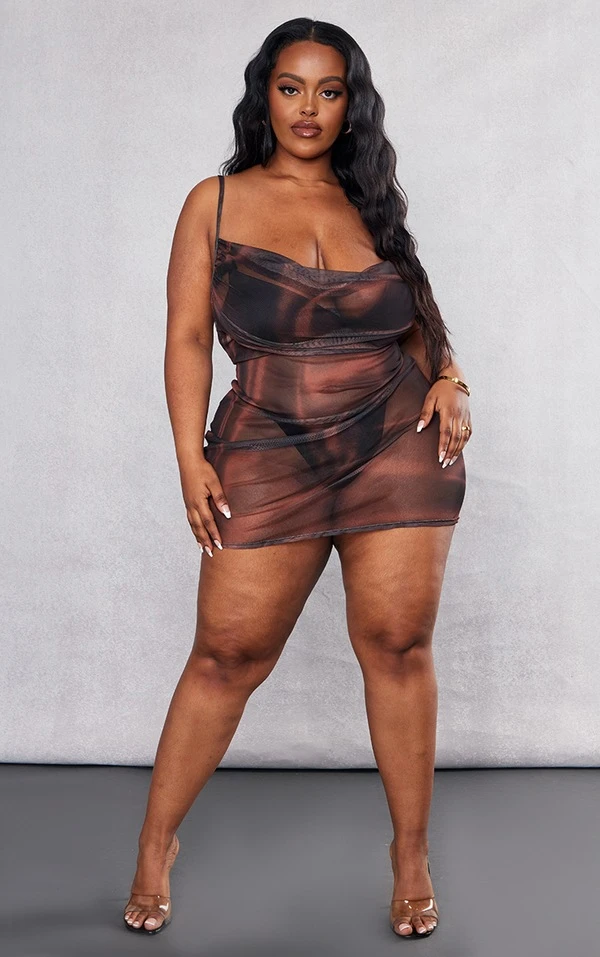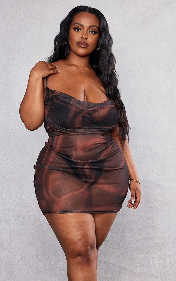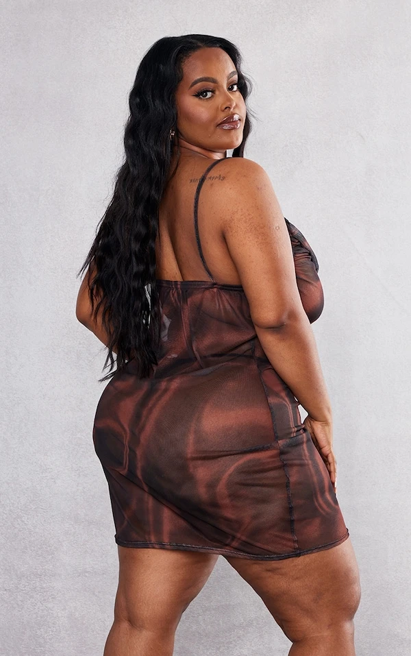 Plus Robe moulante en mesh chocolat imprimé effet satiné à col bénitier