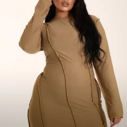Plus Robe moulante gris pierre à coutures surjetées et manches longues