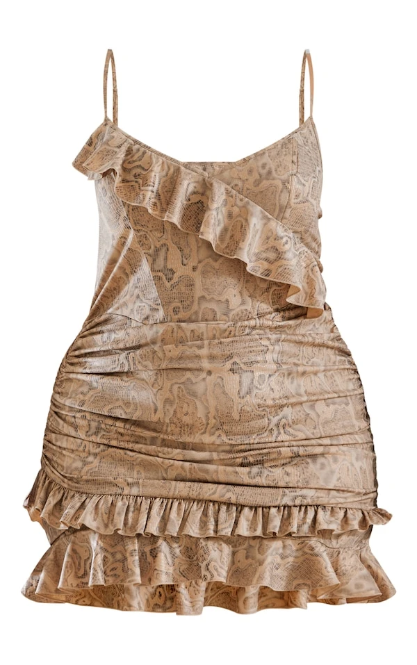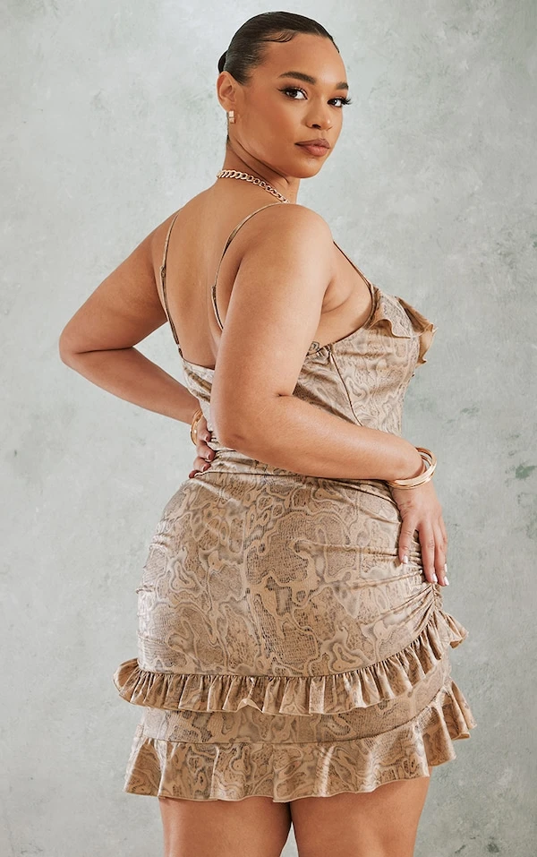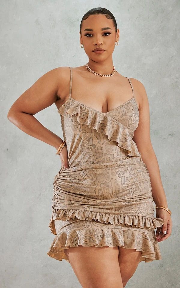 Plus Robe moulante gris pierre à imprimé serpent et volants