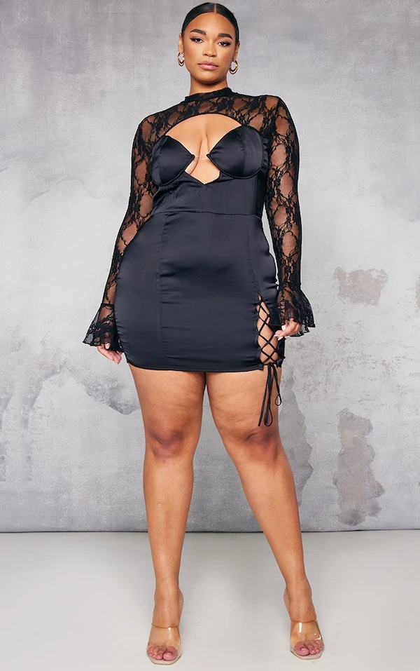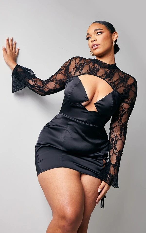 Plus Robe moulante noire satinée en dentelle à détail froncé