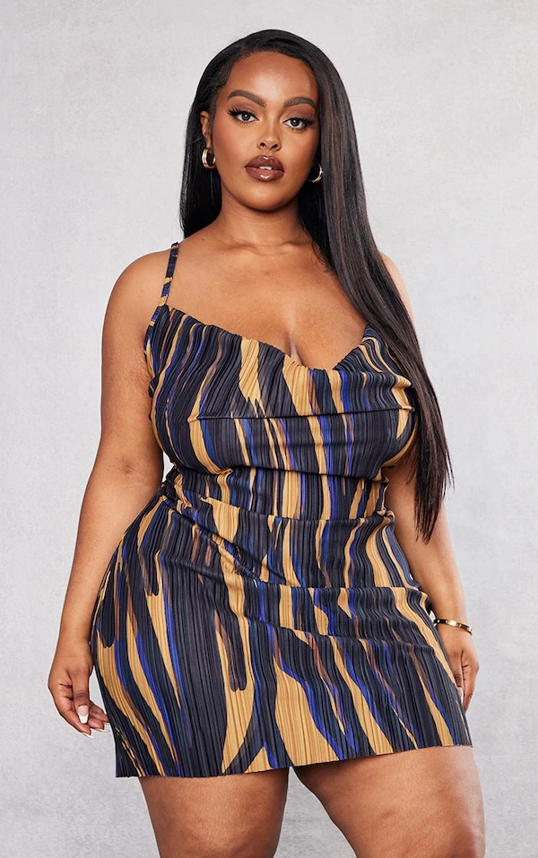 Plus Robe moulante plissée marron à imprimé zèbre et col bénitier