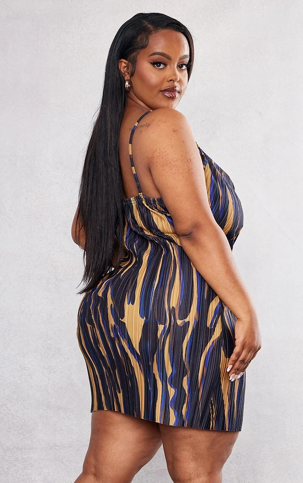 Culte dans cette robe moulante à la matière plissée. On est fans de ses zébrures imprimées, de sa couleur marron et de son design à col bénitier. En soirée, démarquez-vous en l’enfilant avec une paire de mules et quelques accessoires. Vous avez tout compris, vous !