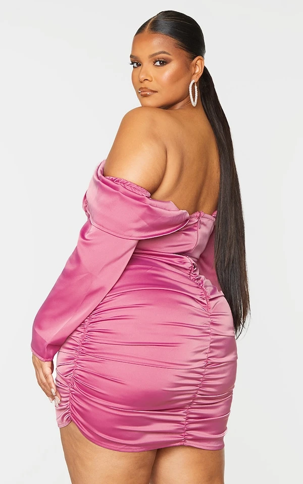Plus Robe moulante satinée drapée rose à col bardot et manches détail dos froncé