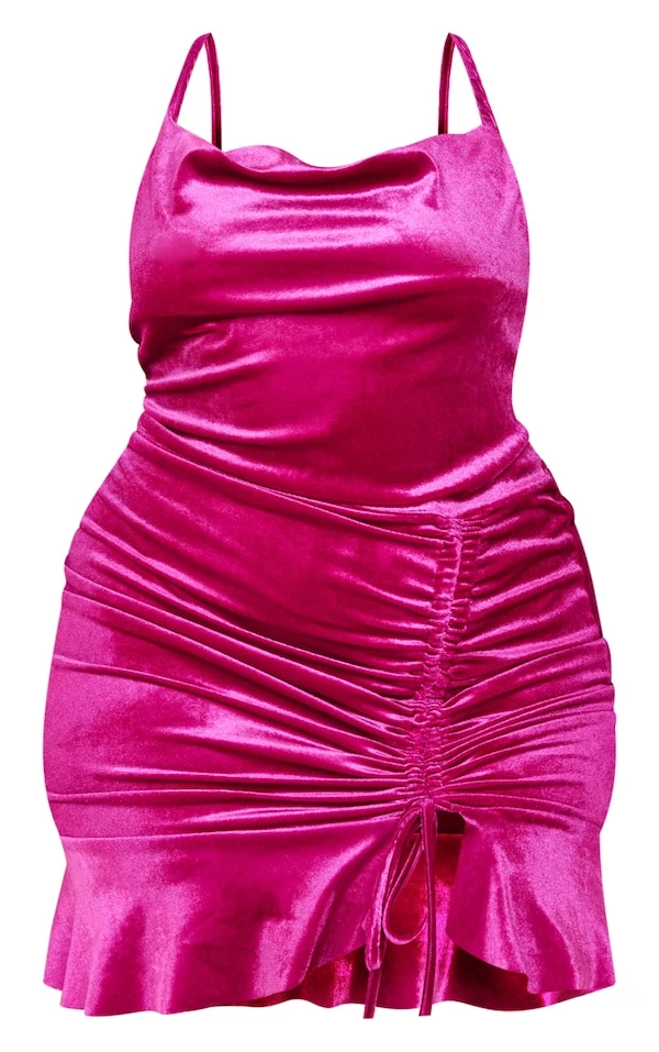Plus Robe moulante volantée en velours fuchsia à bretelles et fronces