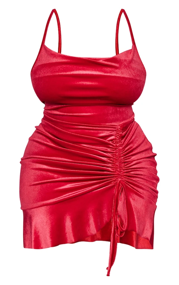 Plus Robe moulante volantée en velours rouge à bretelles et fronces