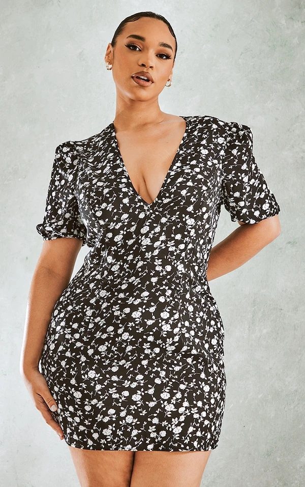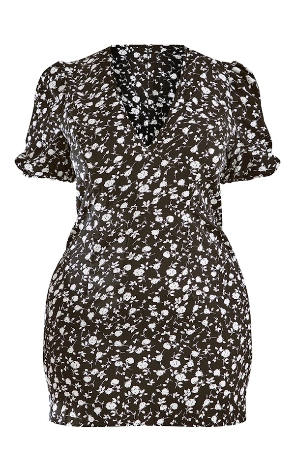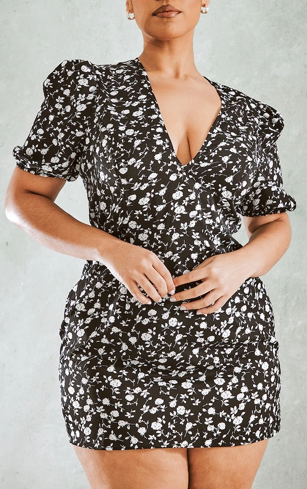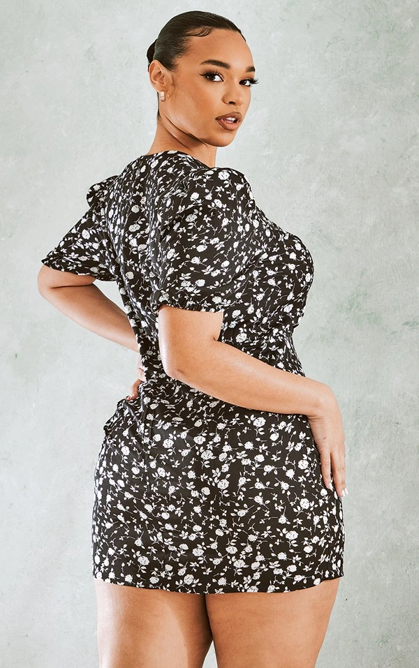 Plus Robe rétro noire à imprimé petites fleurs et manches bouffantes