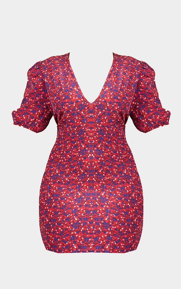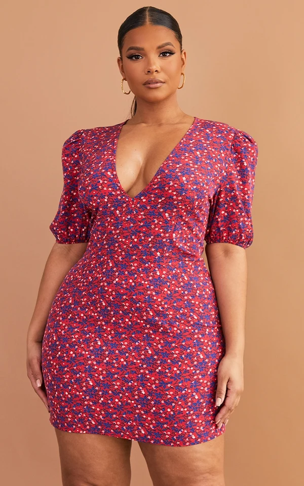 Plus Robe rétro rouge fleurie à manches bouffantes et col bardot