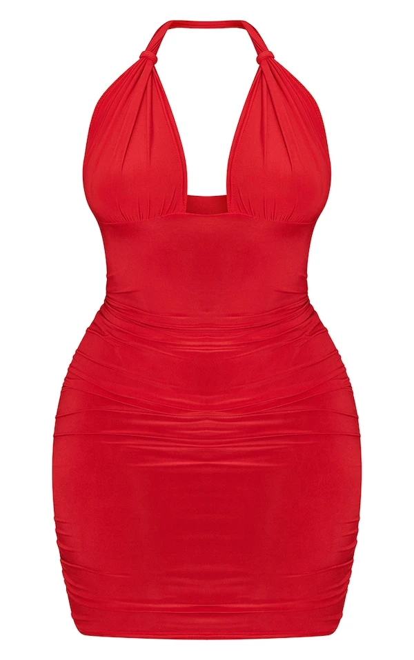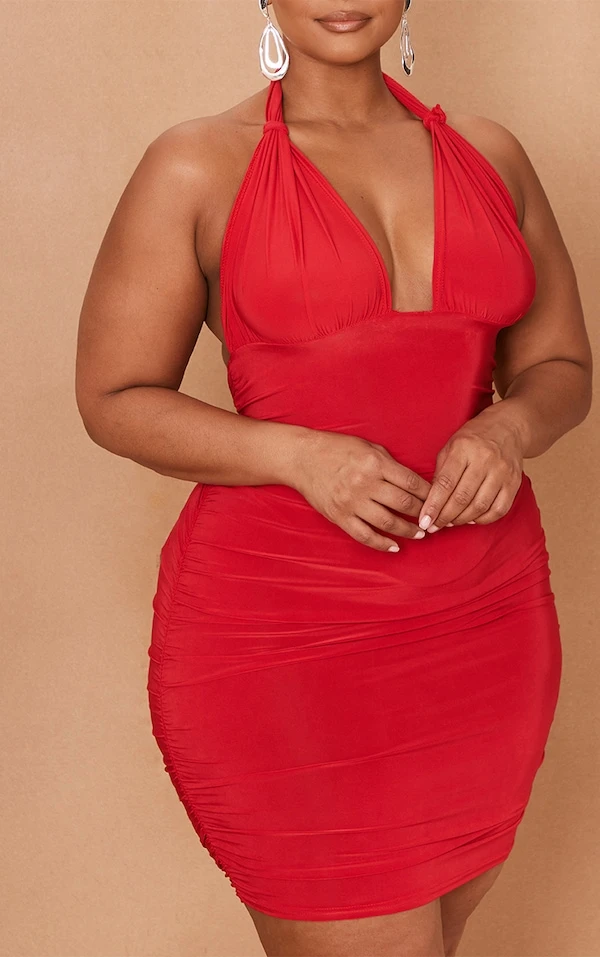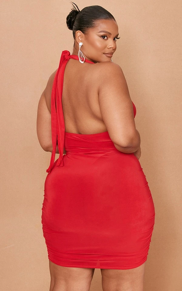 Plus Robe très moulante froncée rouge à dos nu et armatures