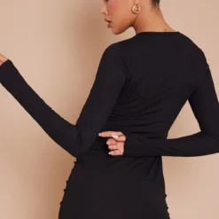Robe Moulante Côtelée Bleu Clair Froncée Sur Les Côtés à Mancherons