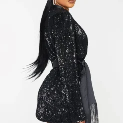 Robe Blazer Satinée Blanche à Dos Découpé Et Franges Strassées