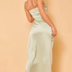 Robe Droite Satinée Vert Sauge à Bretelles Et Découpes Latérales